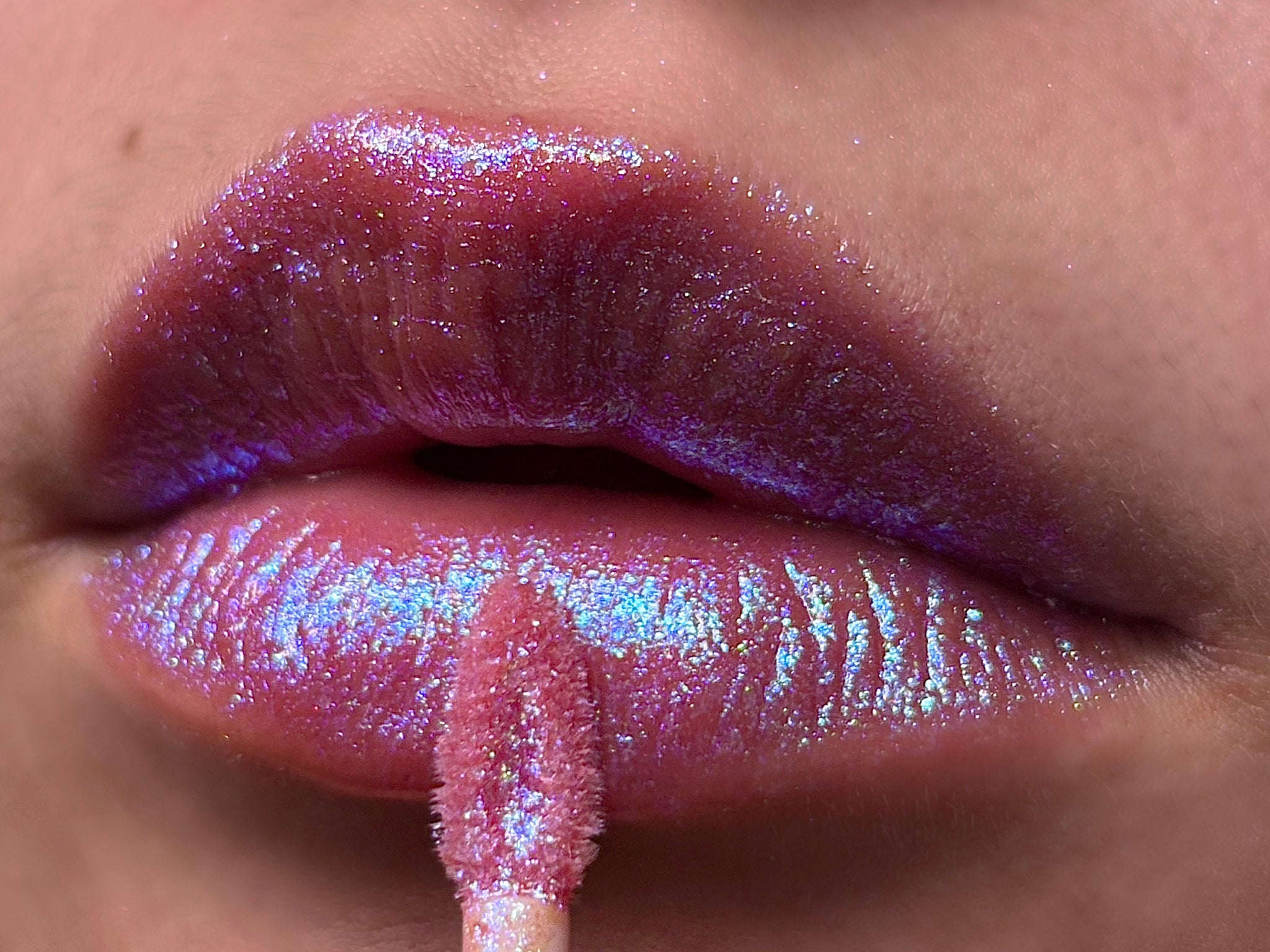 A sparkly, duo chrome gloss that melts into your lips with a glowing, color-shifting finish. It’s glossy, magical, and made to shine with every movement.