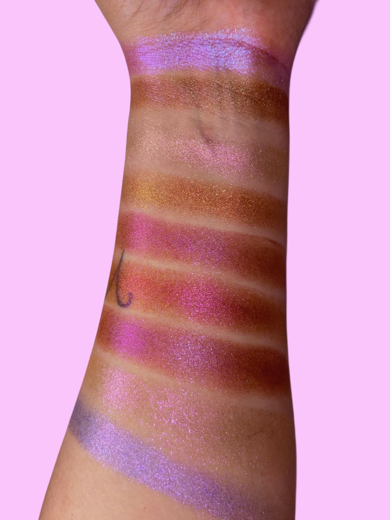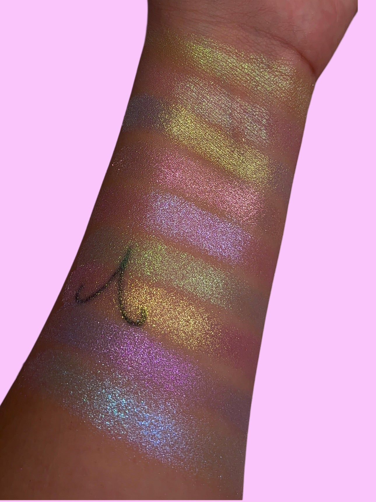 A soft, whimsical rainbow of shimmers that glow and shift in the light. Think dreamy pastels with a magical, ethereal finish, perfect for creating that fairycore glow.