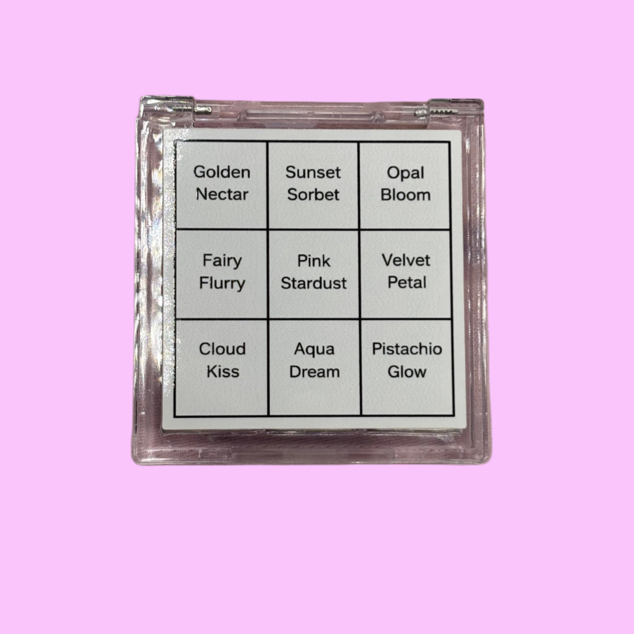 Shades:Golden Nectar, Sunset Sorbet, Opal Bloom, Fairy Flurry, Pink Stardust, Velvet Petal, Cloud Kiss, Aqua Dream, Pistachio Glow
